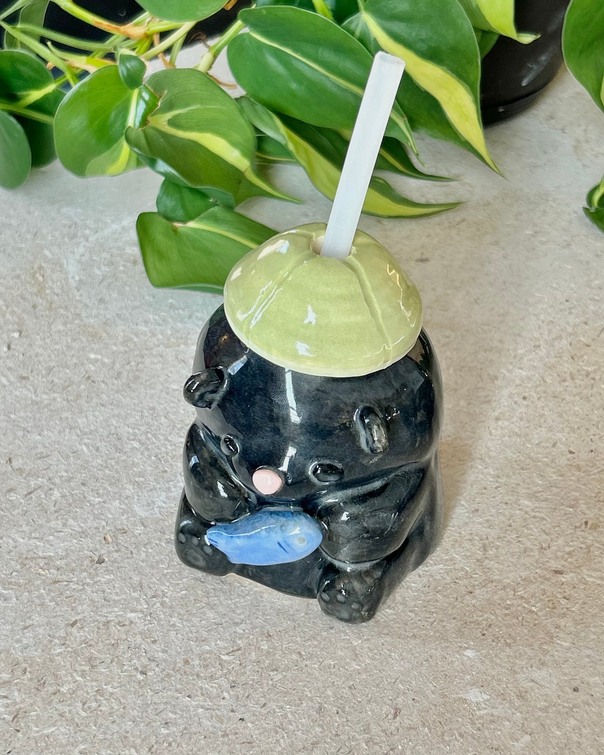 a bear to hold your coffee! each tumbler is handmade and comes with a beanie lid with a hole for a straw. (Straw not included)