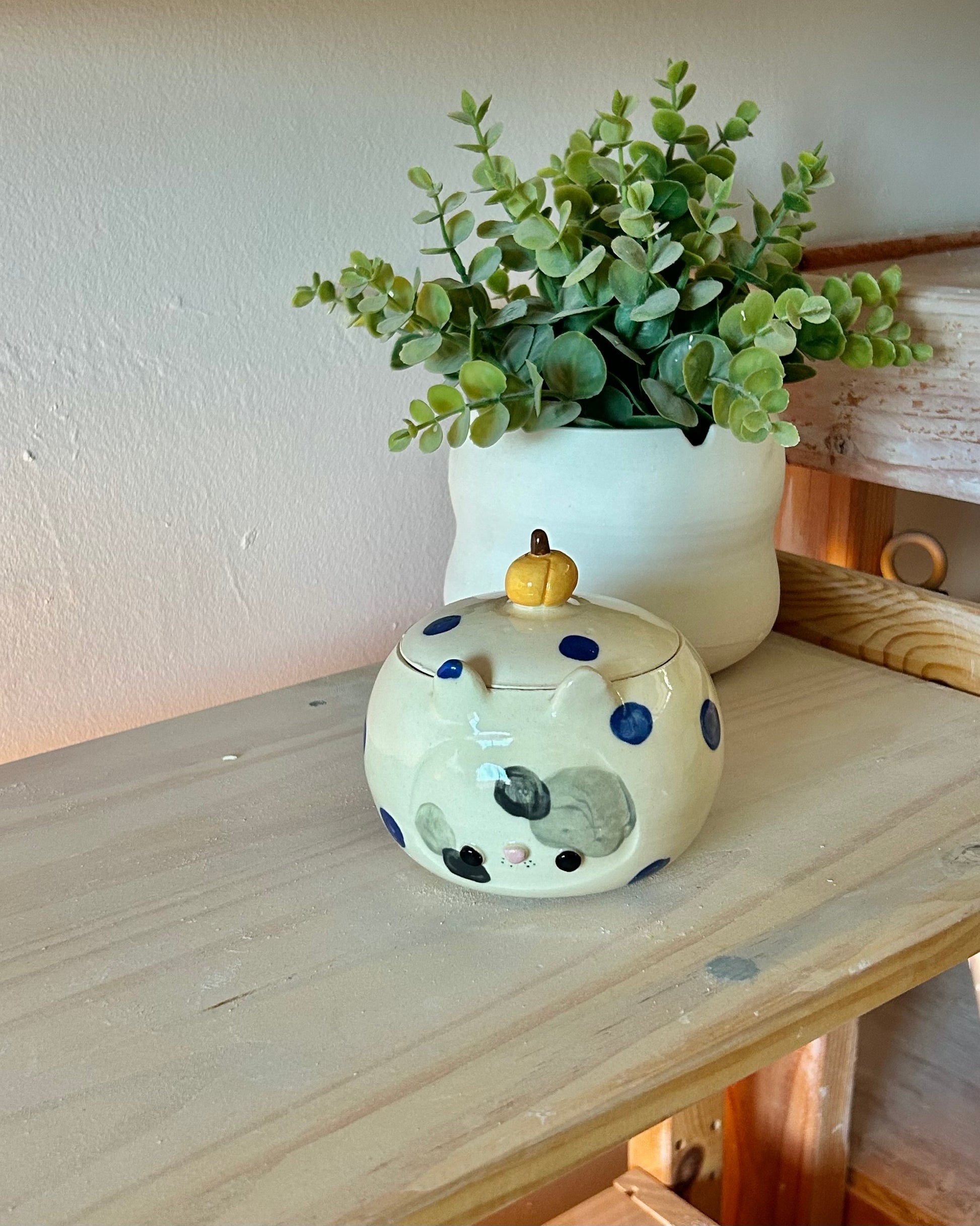 a cozy cat with a headscarf in jar form carrying varying vegetables or fruits atop their heads.