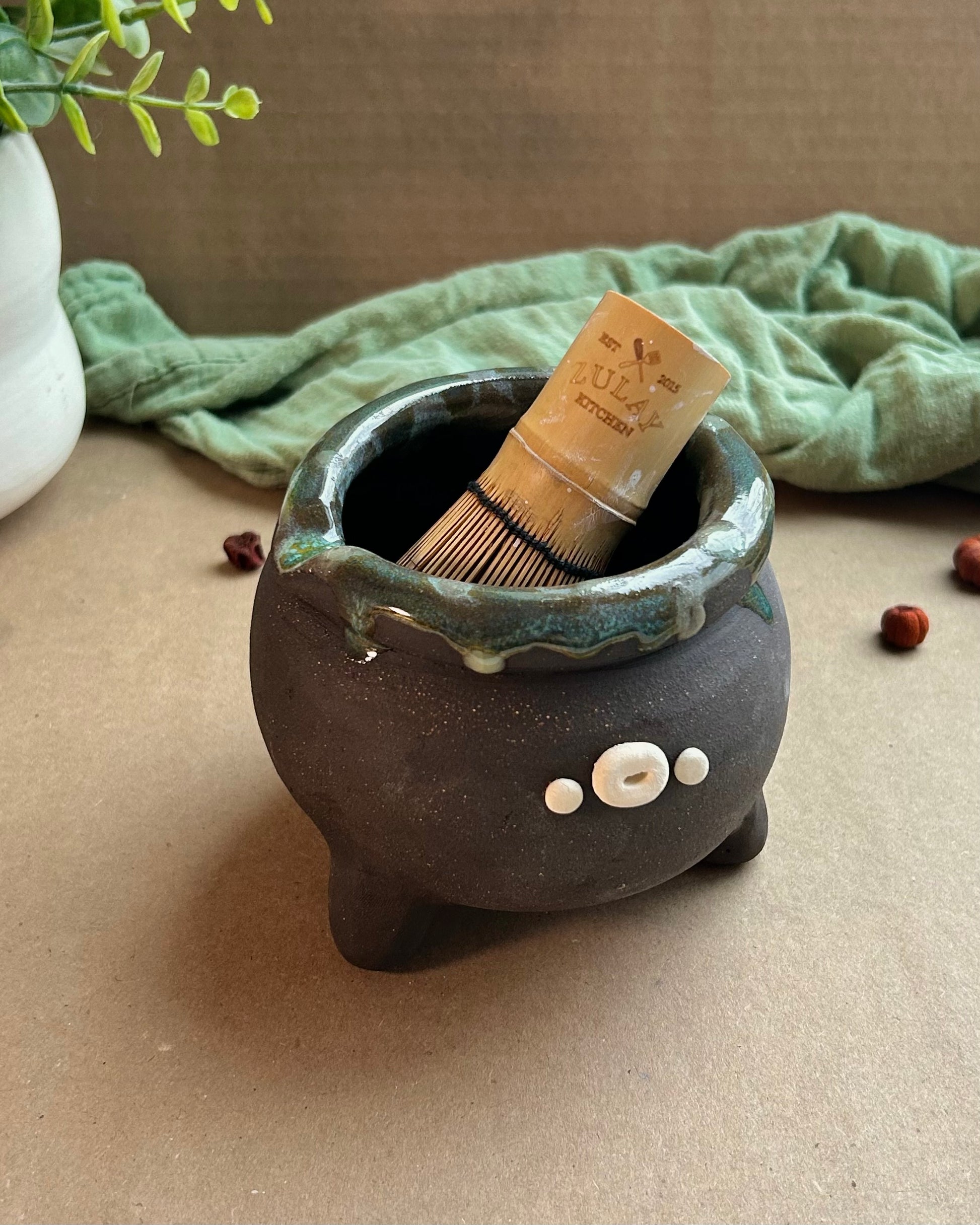 a friendly cauldron to brew your matcha in. comes in multiple different colors: seafoam, matcha, jade, cornflower blue, and purple.
