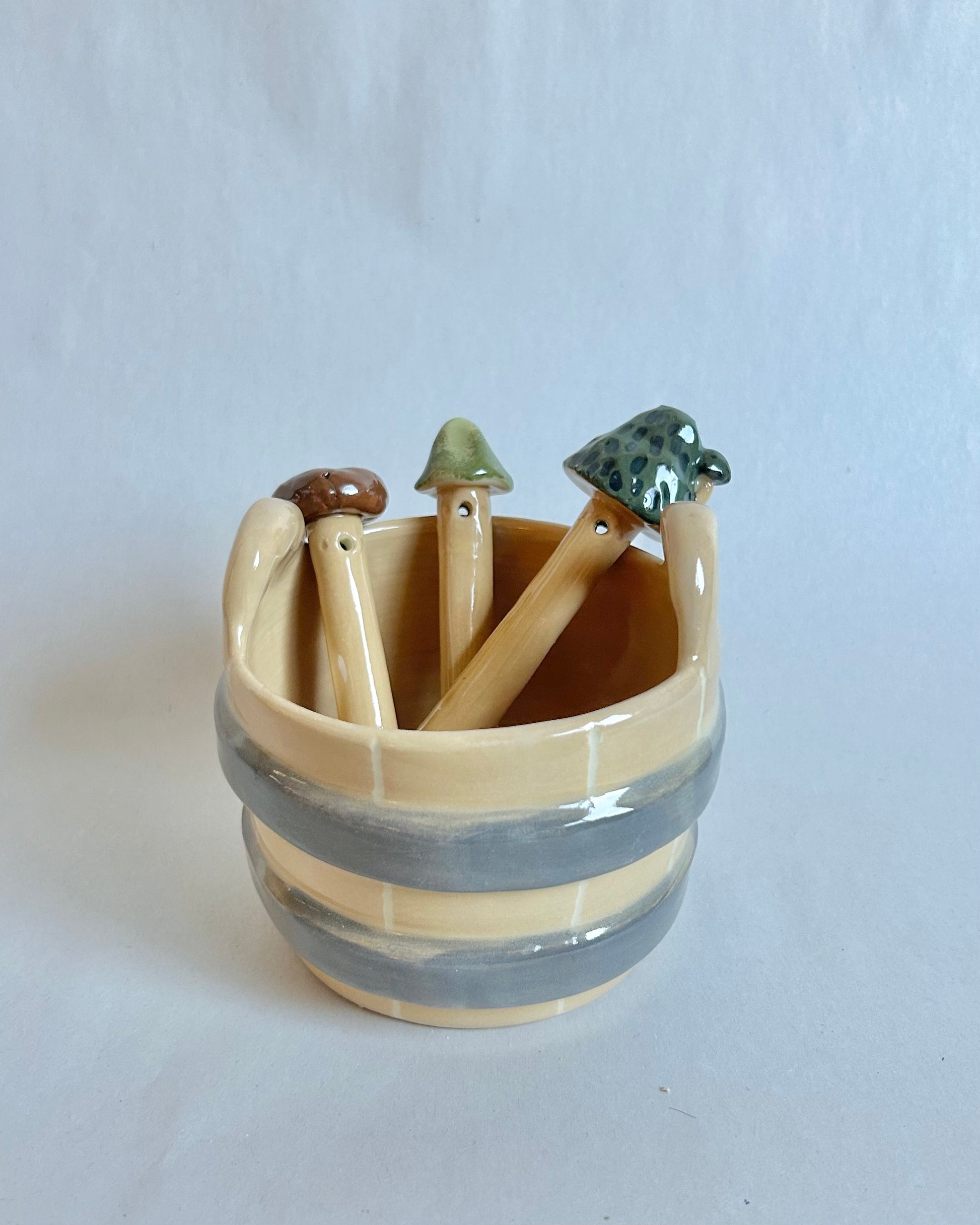 a mix of foraged mushroom spoons, to be kept in a bucket cup. each mushroom spoon set is unique and comes with a bucket that has a 1 cup measurement on the interior. perfect for mixing tea or sprucing up a parfait bowl.