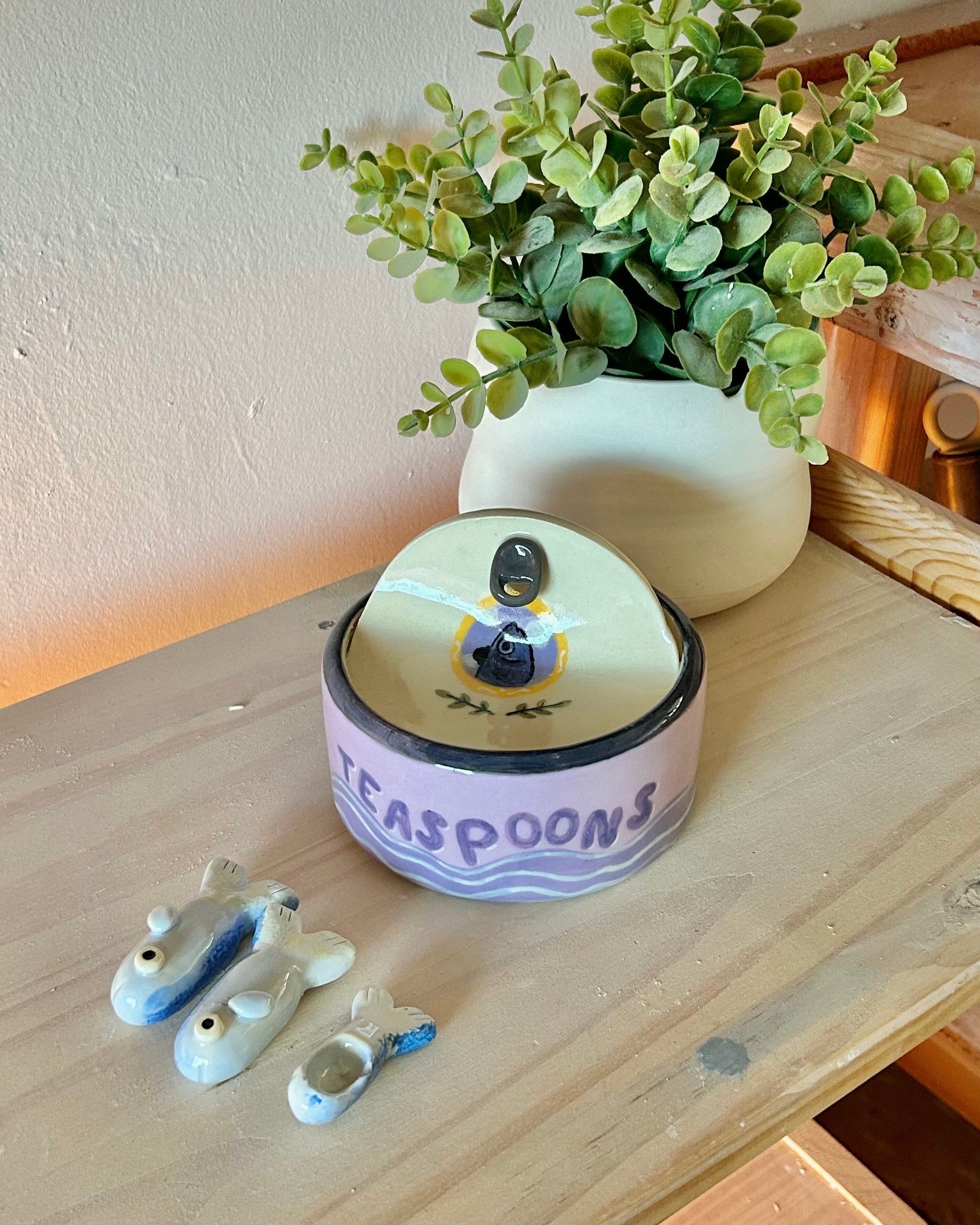 sardines to help you bake! each sardine tin is wheel thrown with white stoneware clay and hand painted. each tin is one of a kind and inspired by vintage tinned fish designs. this teaspoon set comes with a 1/4, 1/2, and 1 teaspoon.