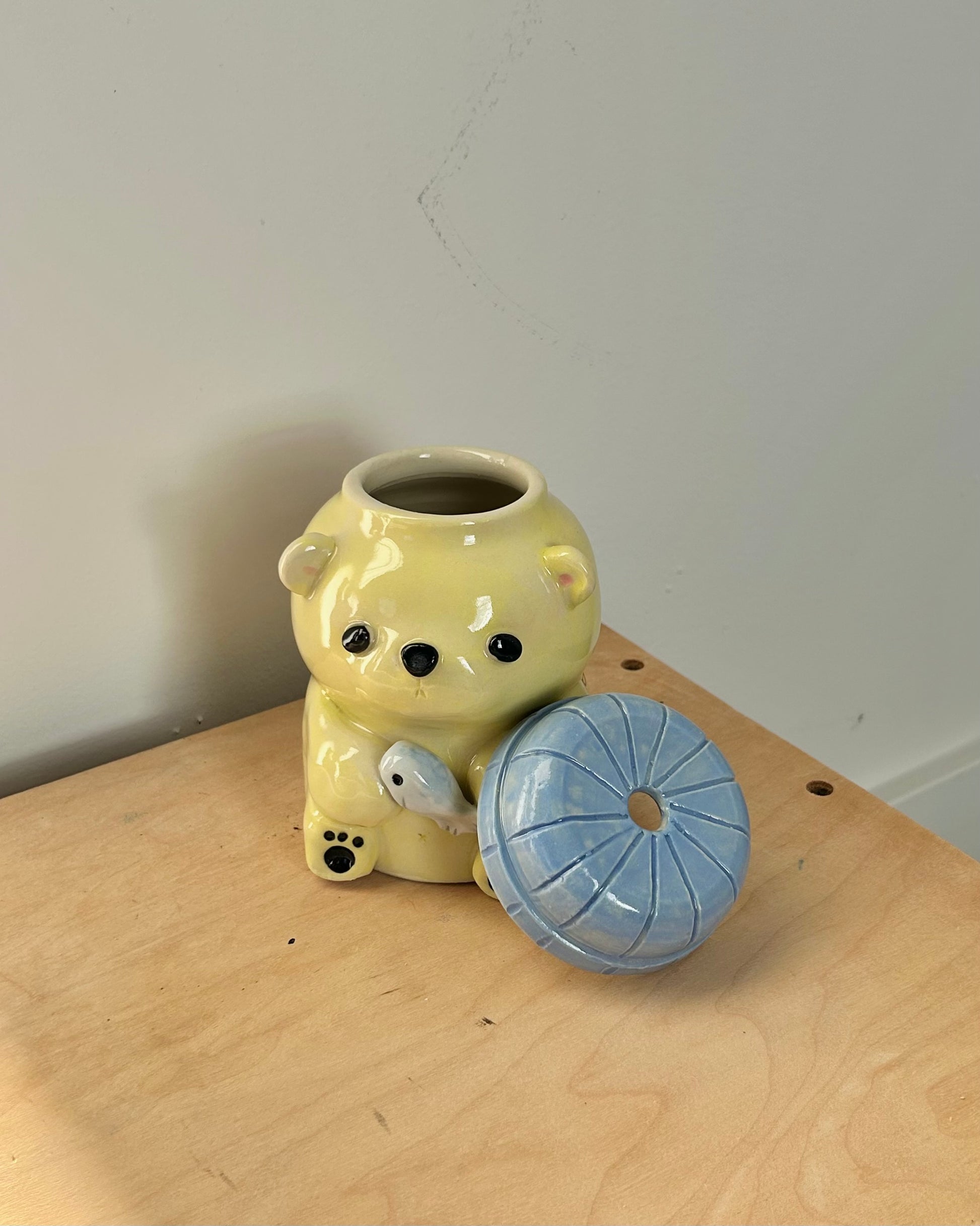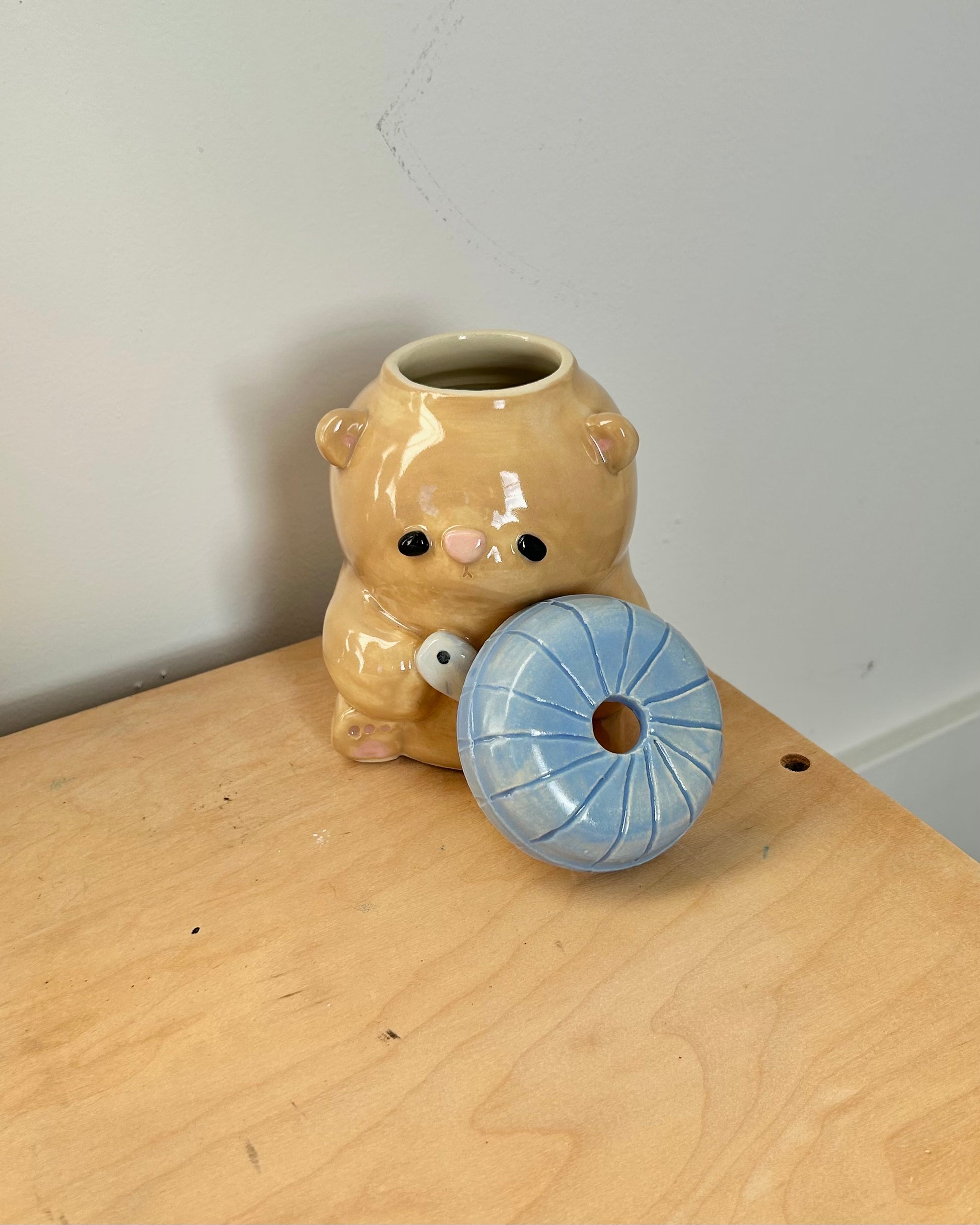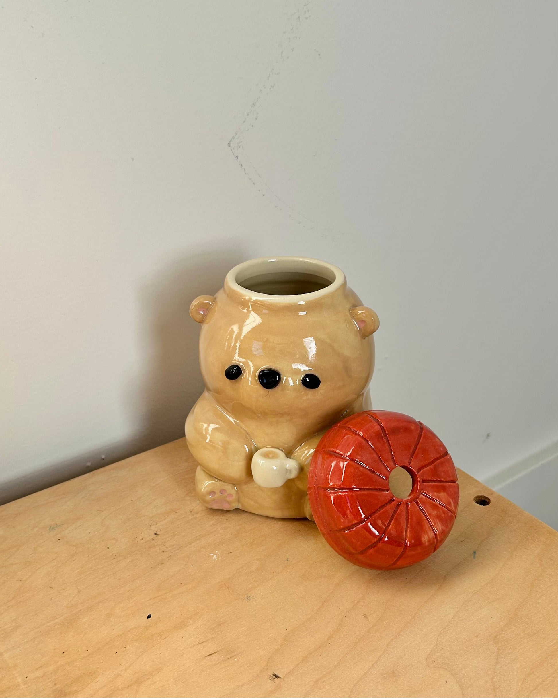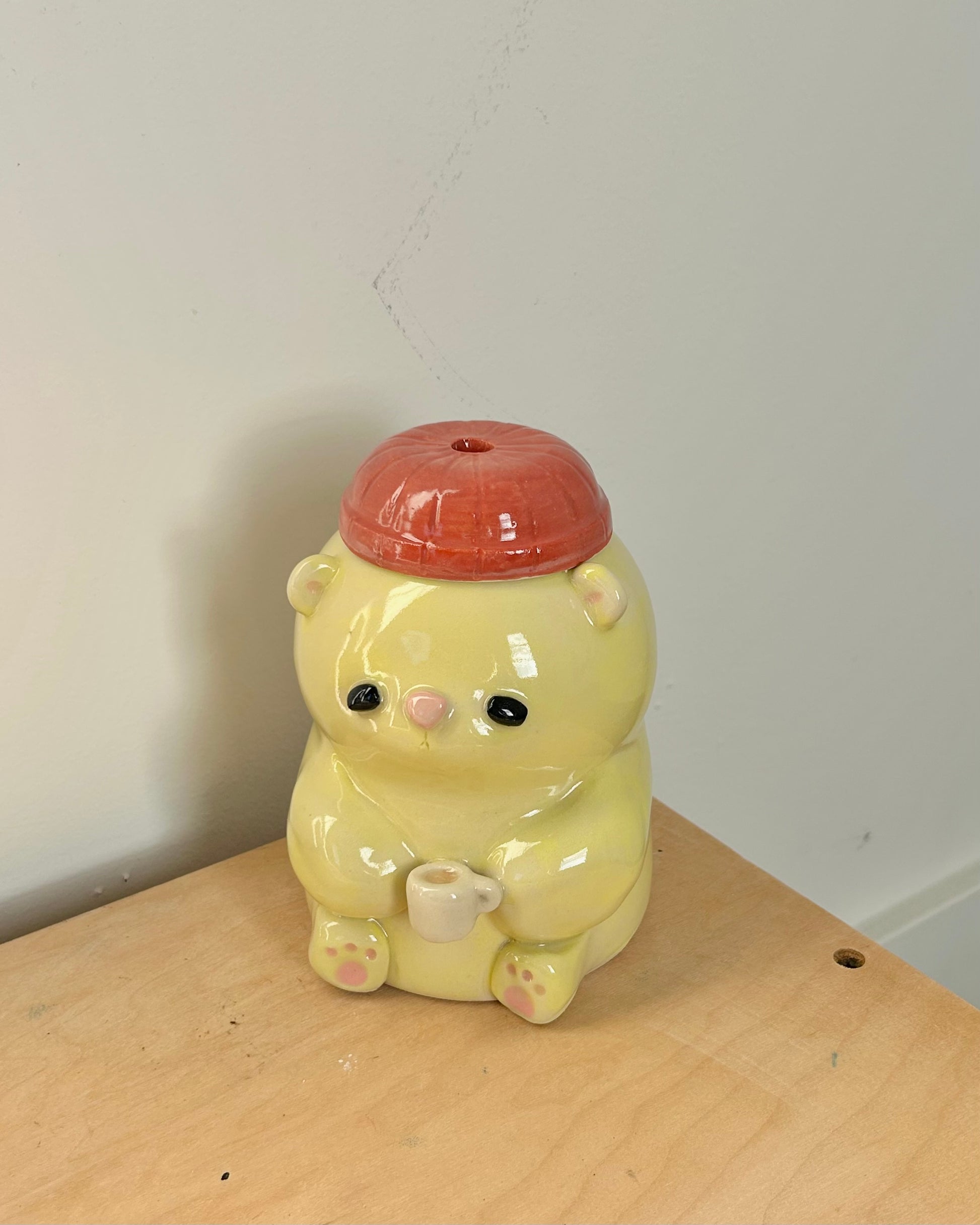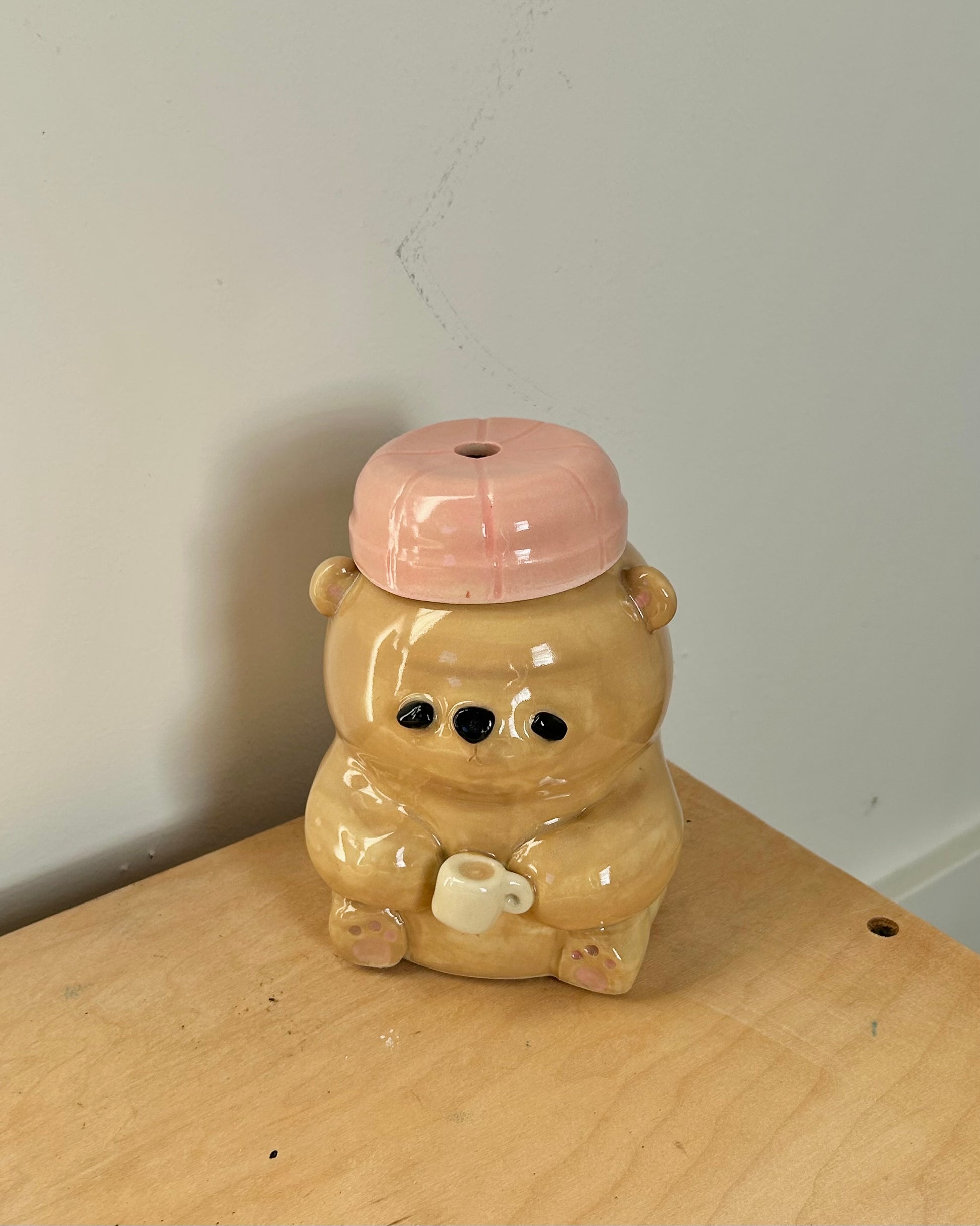 a stack of pancakes when flipped upside down, and a to go cup when right side up. the bottom of the cup is concave so that the butter doesn't effect the way it sits. glossy on the inside and around the sipping hole, matte on the outside to mimic pancakes.