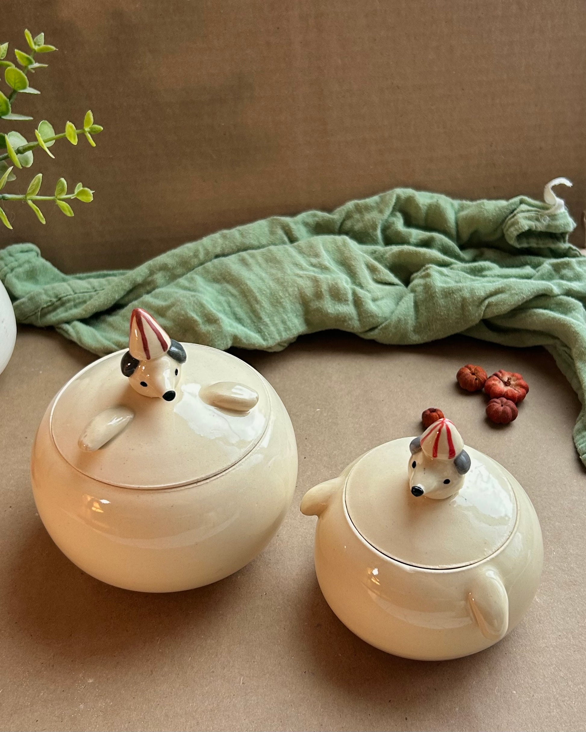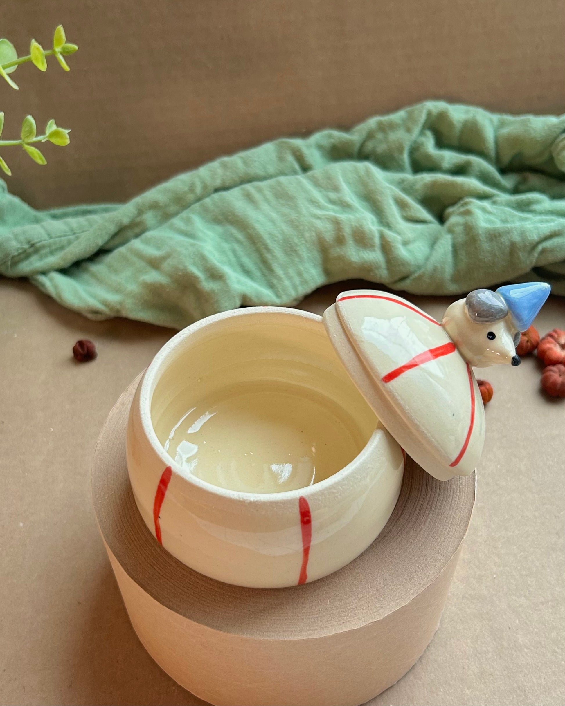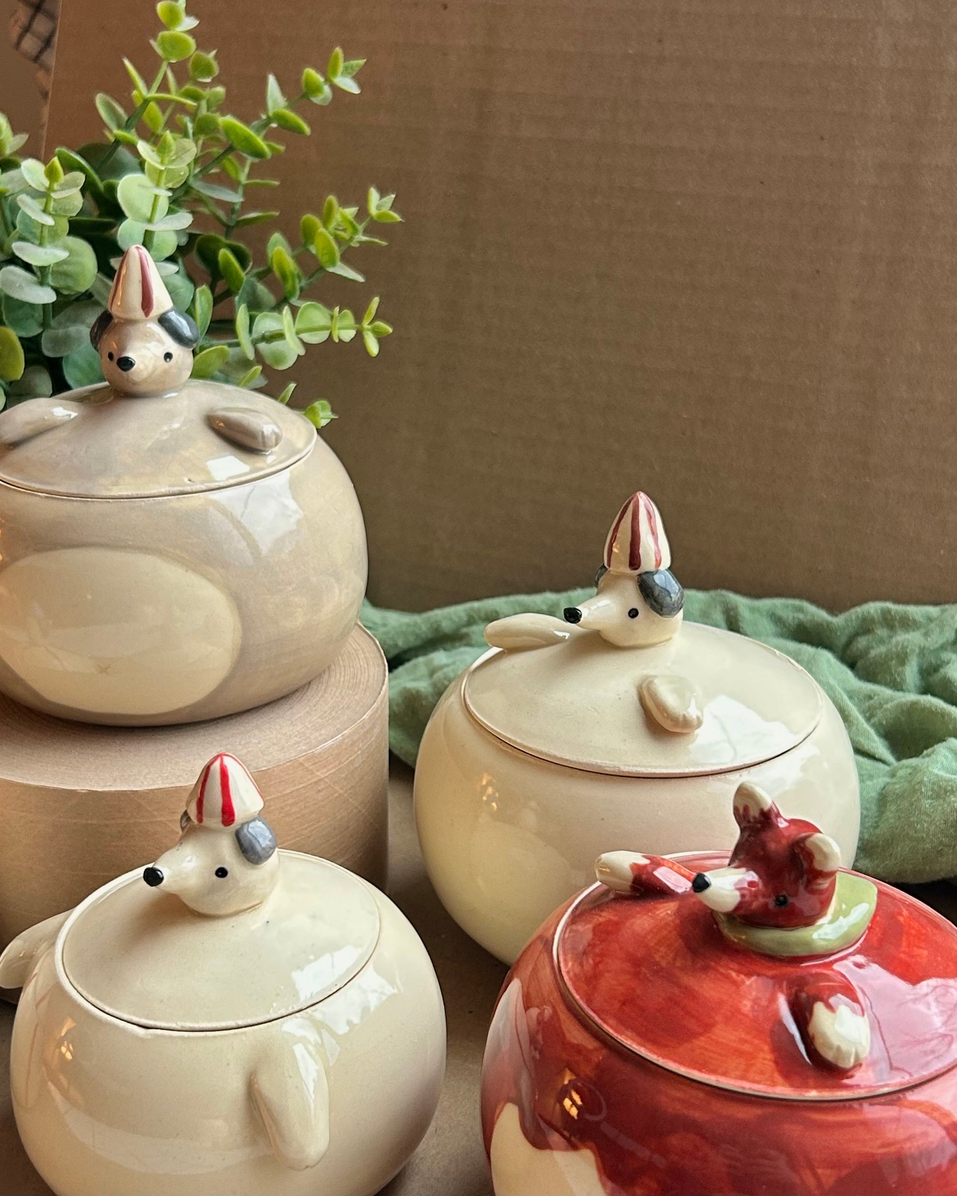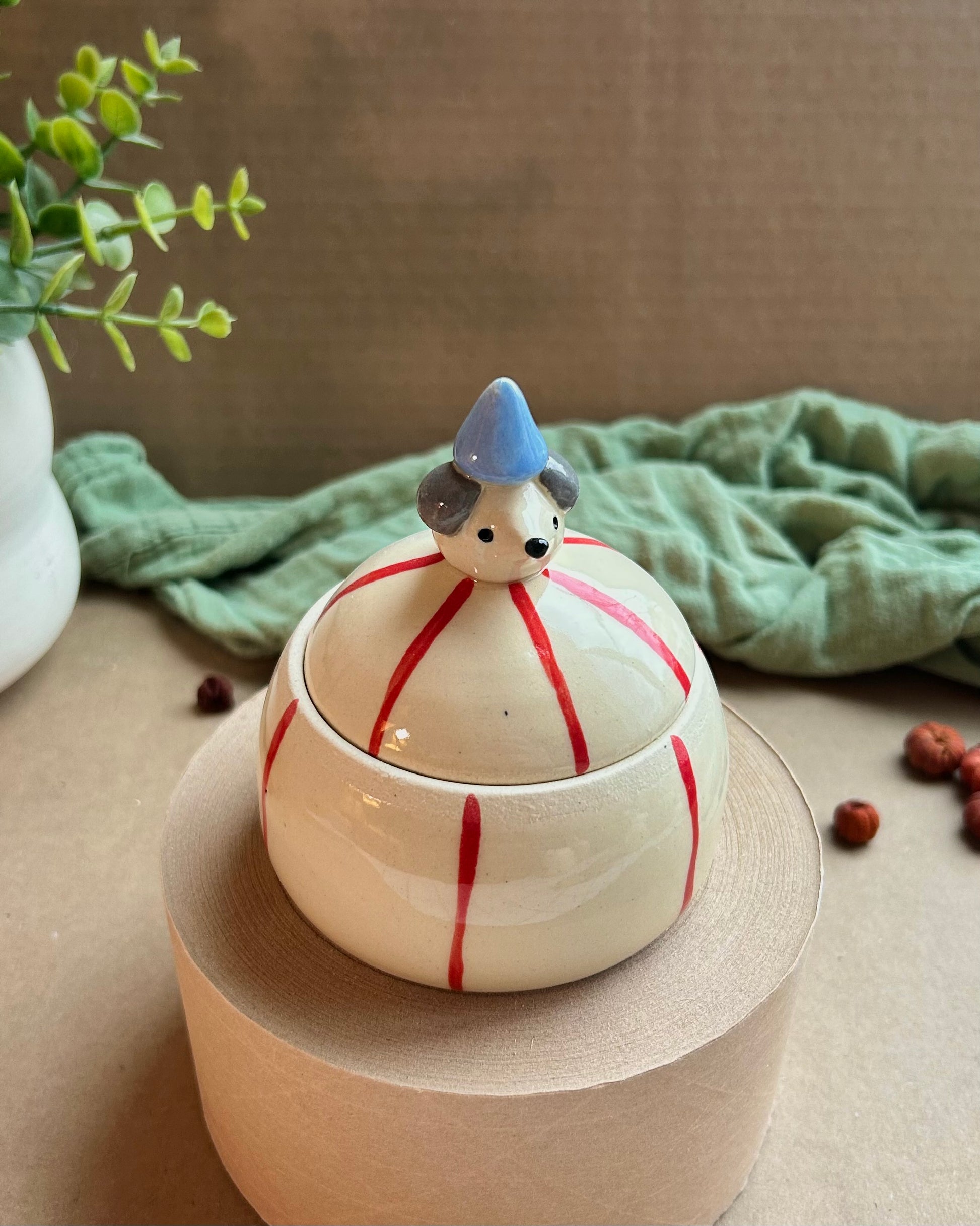 a cute circus dog or fox in jar form to carry your trinkets. hand thrown on the wheel with stoneware clay.