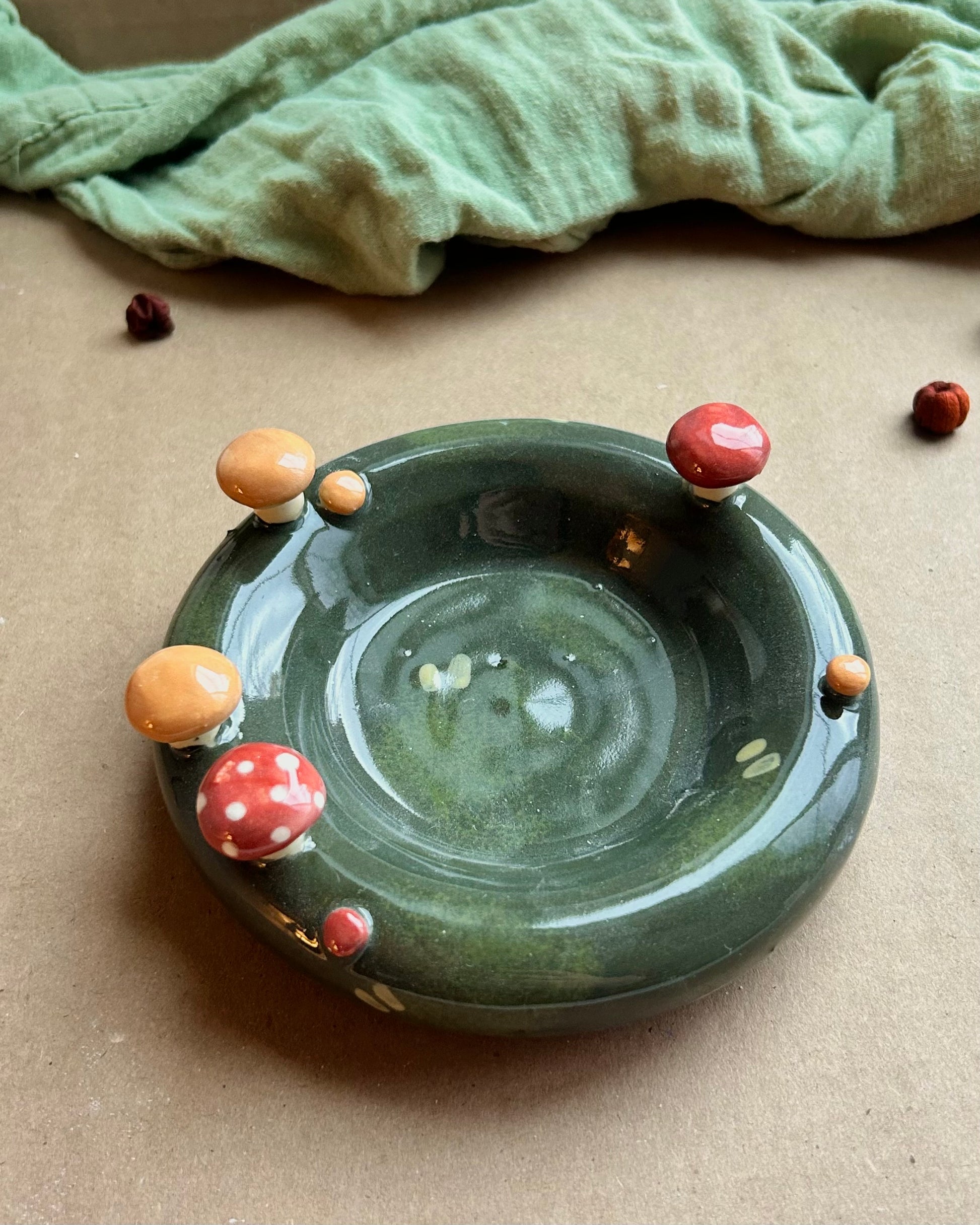 a bubble dish ringed with mushrooms to look like a "fairy ring". hand thrown with stoneware clay on the wheel.