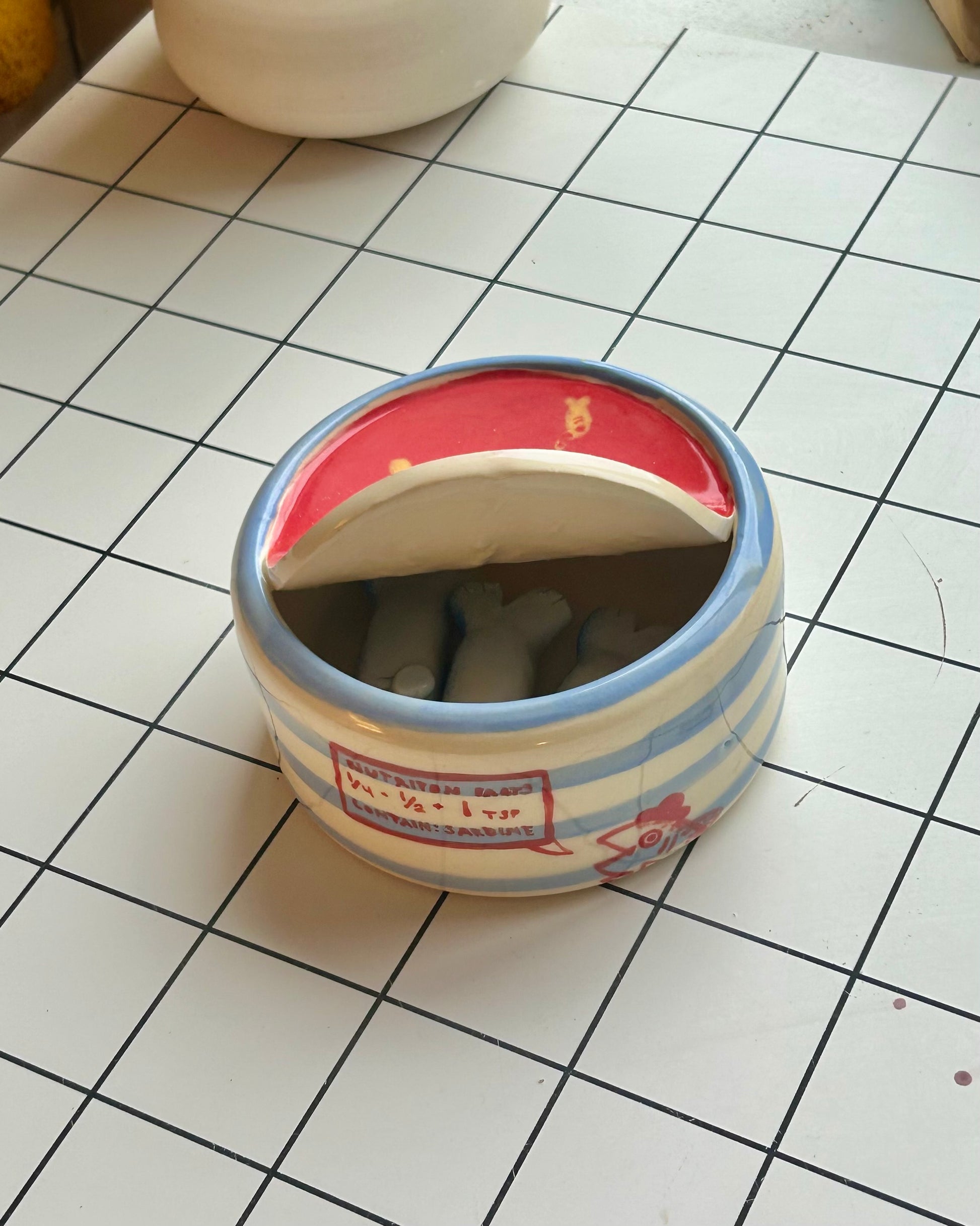 sardines to help you bake! each sardine tin is wheel thrown with white stoneware clay and hand painted. each tin is one of a kind and inspired by vintage tinned fish designs. this teaspoon set comes with a 1/4, 1/2, and 1 teaspoon.